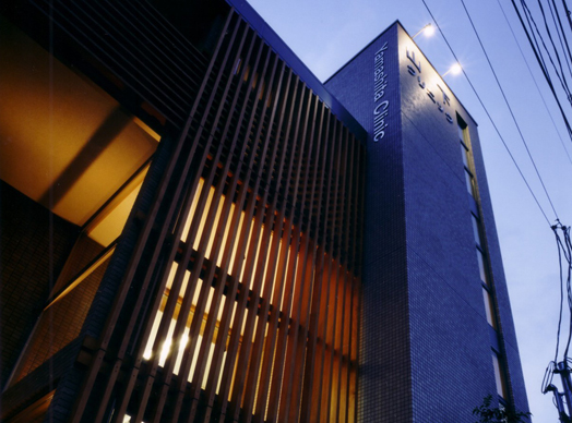 黄昏時、あたたかい光に浮かび上がる、クリニックエントランスの木の格子