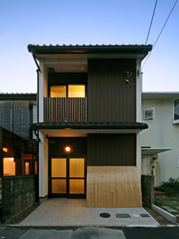 【左】薄暮に家のあかりが家人を迎え入れるM邸
